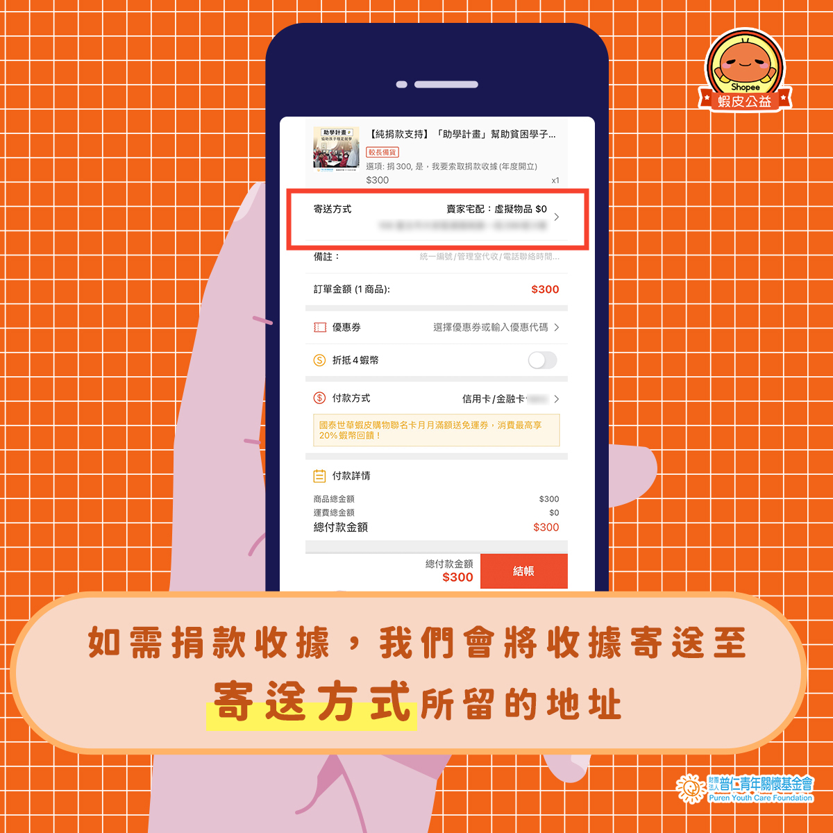📍如需索取「捐款收據」者,於本會收到蝦皮撥款後才會開立捐款收據,並郵寄給您喔。